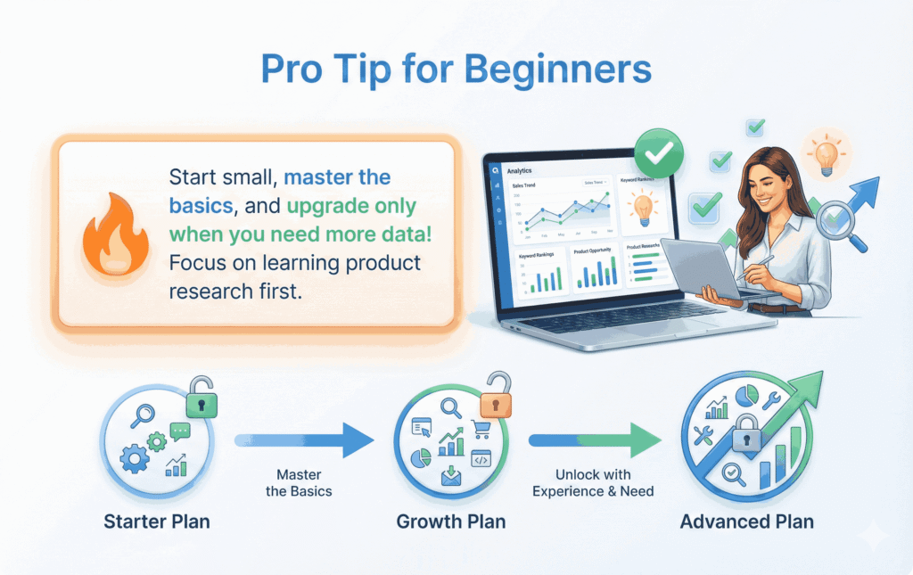 Start with the Starter plan, learn product research properly, then upgrade only when needed.