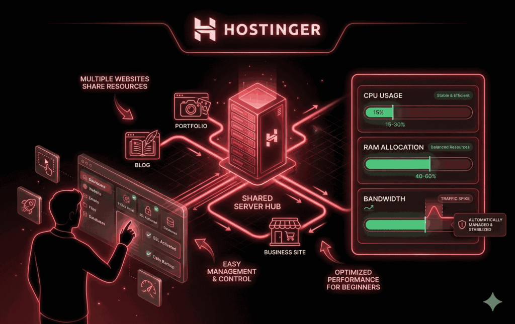 However, there are limitations. If another website on the same server suddenly gets a lot of traffic, it could affect performance. Hostinger mitigates this with resource limits and optimization, but it’s still something to keep in mind. The key takeaway? Shared hosting is perfect for learning and starting, but it’s not meant for massive, high-traffic sites.
