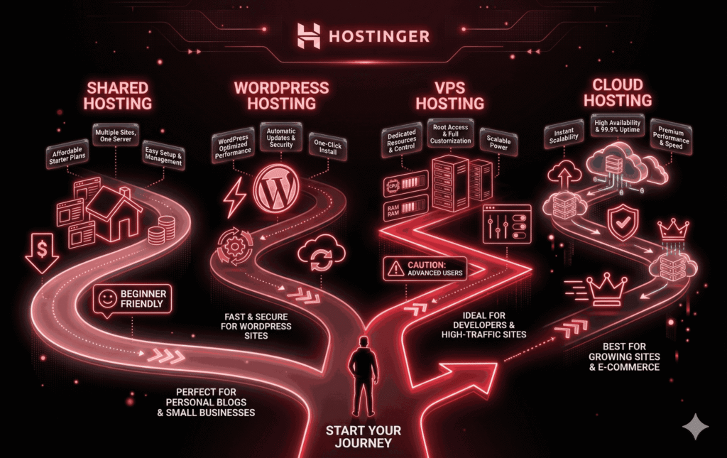 Hostinger offers several types of hosting, and this is where beginners often get confused. The good news is that you don’t need to understand everything at once. Think of these plans as different sizes of apartments—you choose based on how much space and power you need.