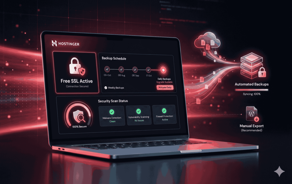 A: Yes. Hostinger includes free SSL, basic backups (on many plans), and optional security tools — enough for a beginner site. For extra safety, maintain your own backups and keep WordPress/plugins updated.